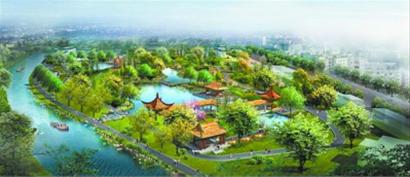 夏芳園位于煤礦設(shè)計(jì)院橋和萬(wàn)泉橋之間,總面積49599平方米,全長(zhǎng)916米,圖為效果圖